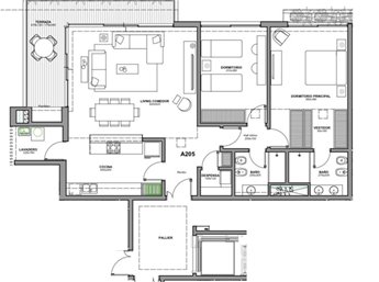 Se compone de un espacioso living comedor, con amplios ventanales con hermosas cortinas de lino y salida a una gran terraza con parrillero propio con parrilla de acero inoxidable.